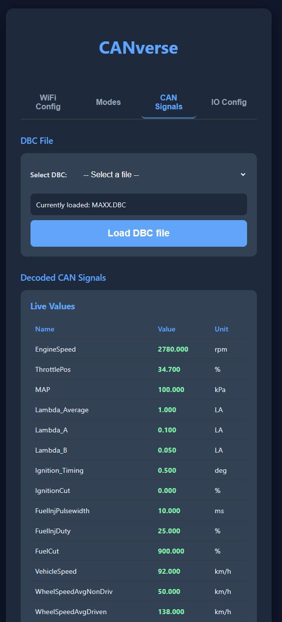View live CAN data with real-time signal decoding using DBC files stored on the device. Monitor values with names, units, and scaling applied.