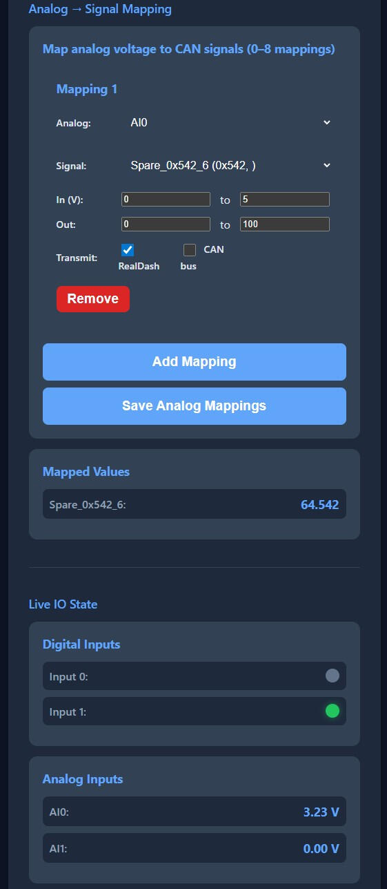 Map digital and analog inputs/outputs to CAN signals. Apply scaling directly in the web interface to integrate sensors and control systems seamlessly.