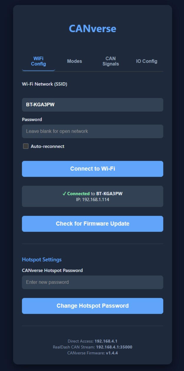 Connect to CANverge instantly over WiFi through a built-in web interface. View decoded CAN signals in real time, configure inputs and outputs, and manage your setup from any device—no software installation required.